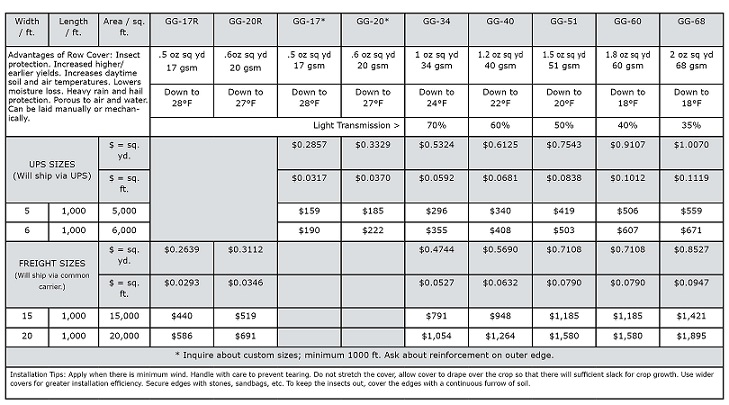 Item No 114 Spunbonded Row Cover for Frost and Insect protection Seven different densities available. Many different sizes including custom sizes. CLICK ON THE GRID PHOTO FOR FULL PRICING INFORMATION.