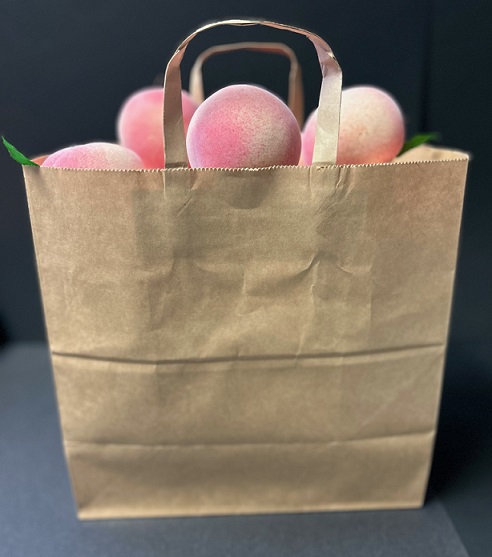 Item No 1584 1/2 Bushel Brown Paper Tote Bag 250 pack 1/2 bushel brown handle tote bag, 12 x 6.5 x 12 inches tall, Two Strong flat Handles, bottom chip cardboard insert 100 gsm- brown paper, 250 pack